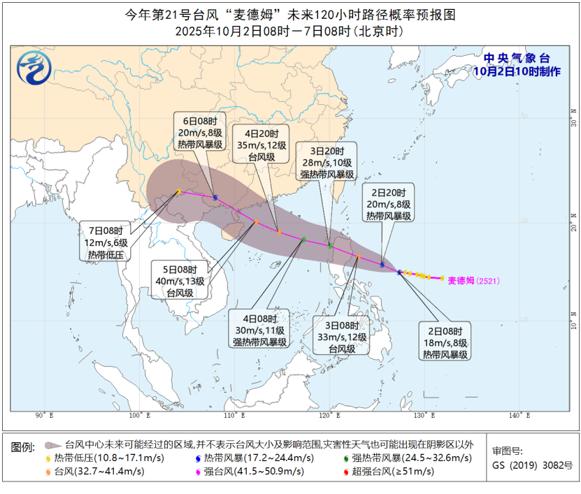 预计,“麦德姆”将以向西偏北方向移动,强度逐渐增强,3日白天将在菲律宾吕宋岛东部沿海登陆,之后穿过菲律宾吕宋岛北部,3日夜间到4日凌晨将移入南海东部海面,以后逐渐向广东西部到海南岛东部一带沿海靠近。