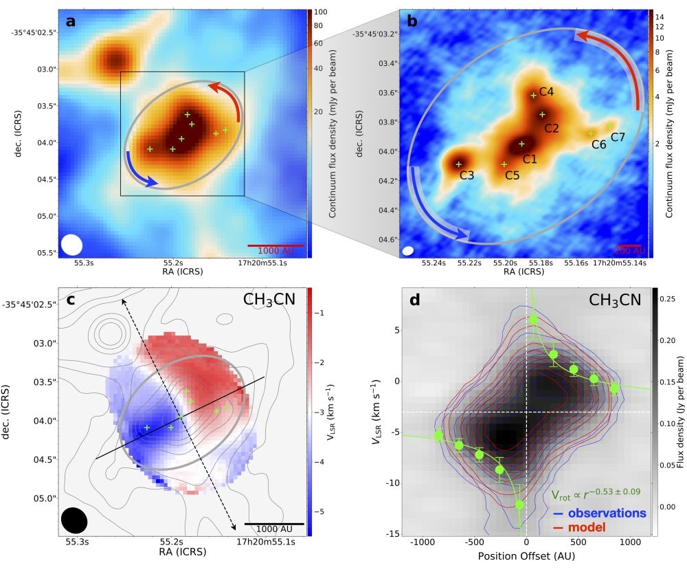 此次,由中、德、美、日、韩、加拿大等国16所高校、科研机构的学者组成一支国际联合团队,利用位于智利的阿塔卡马大型毫米波/亚毫米波阵列望远镜(ALMA),观测了一个距地球约4240光年的大质量恒星形成区NGC6334IN,在其核心区发现7颗原恒星,动力学分析与数值模拟结果显示,这个七星系统由吸积盘碎裂而来。