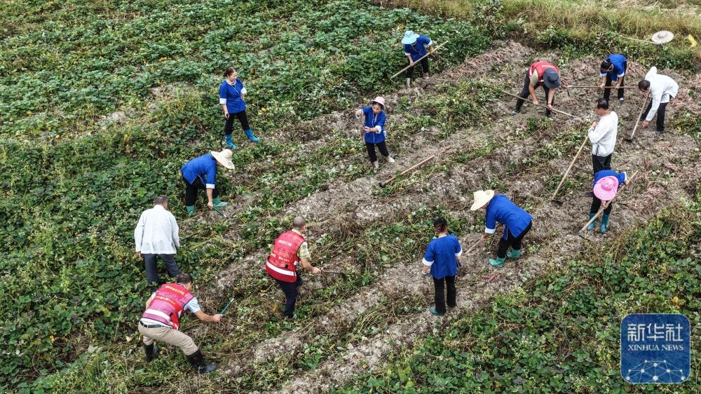 ↑ 10月15日,广西三江侗族自治县林溪镇高秀村村民在田间收获红薯(无人机照片)。新华社记者 张爱林 摄