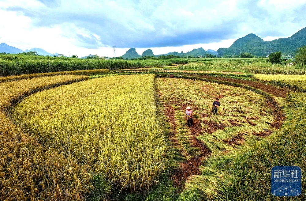 ↑ 10月15日,广西来宾市忻城县城关镇泮水村农民在稻田里抢收稻谷。新华社发(樊绍光 摄)