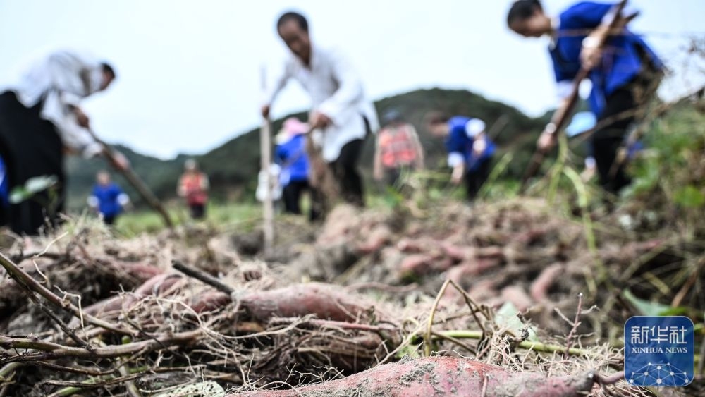 ↑ 10月15日,广西三江侗族自治县林溪镇高秀村村民在田间收获红薯。新华社记者 张爱林 摄