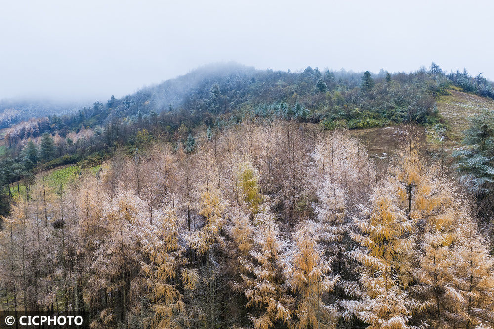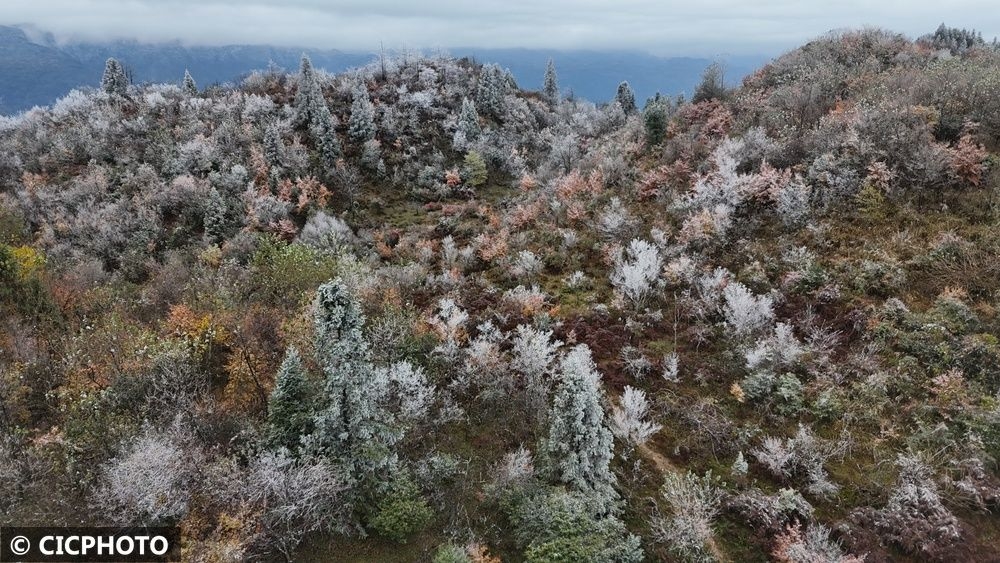 ↑2025年11月18日在重庆市酉阳土家族苗族自治县木叶乡拍摄的雪景。(无人机照片)CICPHOTO/杨长万 摄