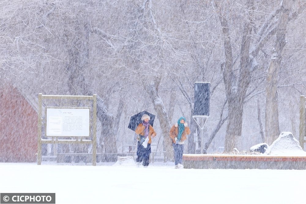 ↑2025年11月13日,新疆阿勒泰市市民冒雪出行。CICPHOTO/阿尔达克·拜斯汗 摄
