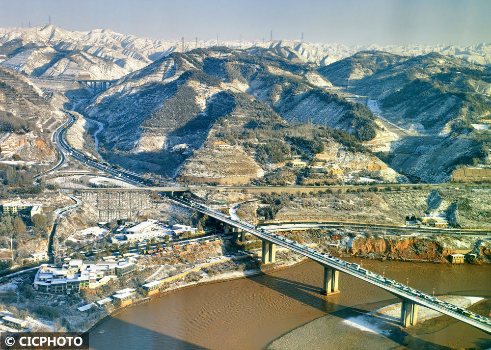 ↑2025年11月24日在甘肃省兰州市中山桥旁拍摄的雪景。CICPHOTO/金万贵 摄