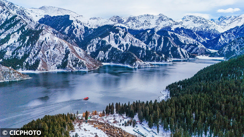↑2025年11月14日,游客乘船在新疆昌吉回族自治州阜康市天山天池景区游玩。(无人机照片)CICPHOTO/陶维明 摄