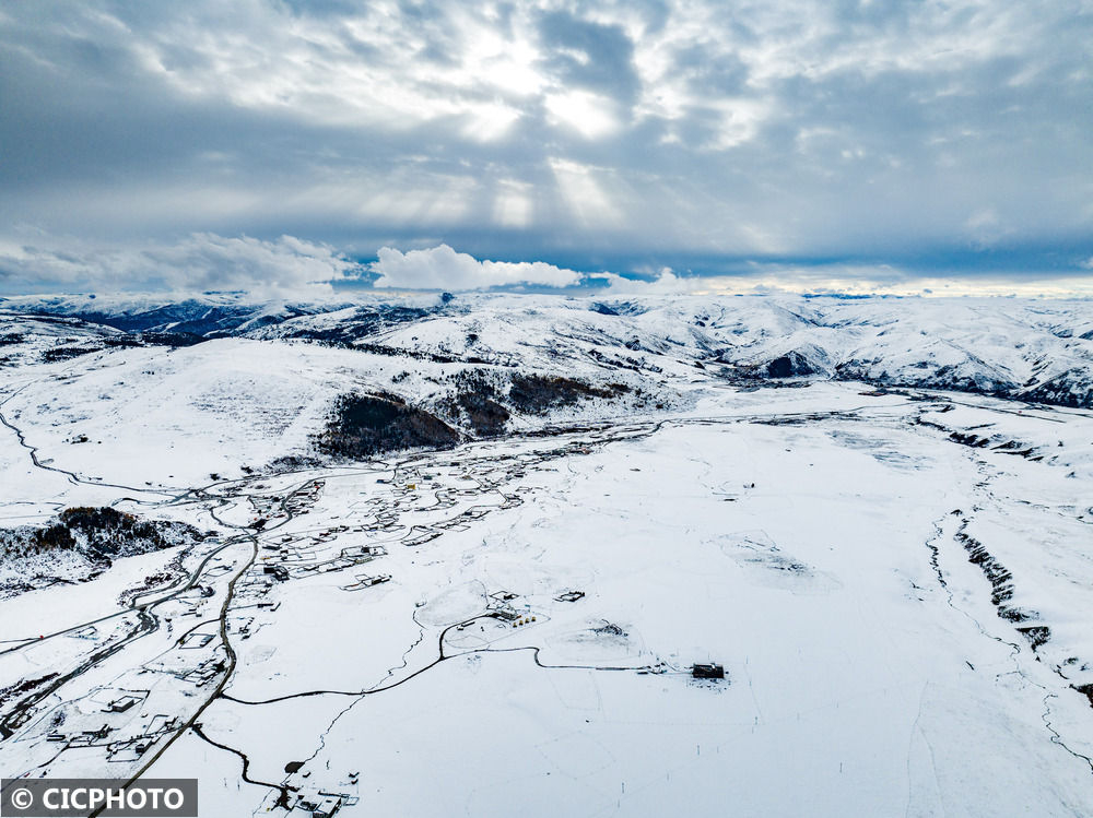 ↑2025年11月3日在四川省甘孜藏族自治州康定市塔公镇拍摄的雪景。(无人机照片)CICPHOTO/黎豪图 摄