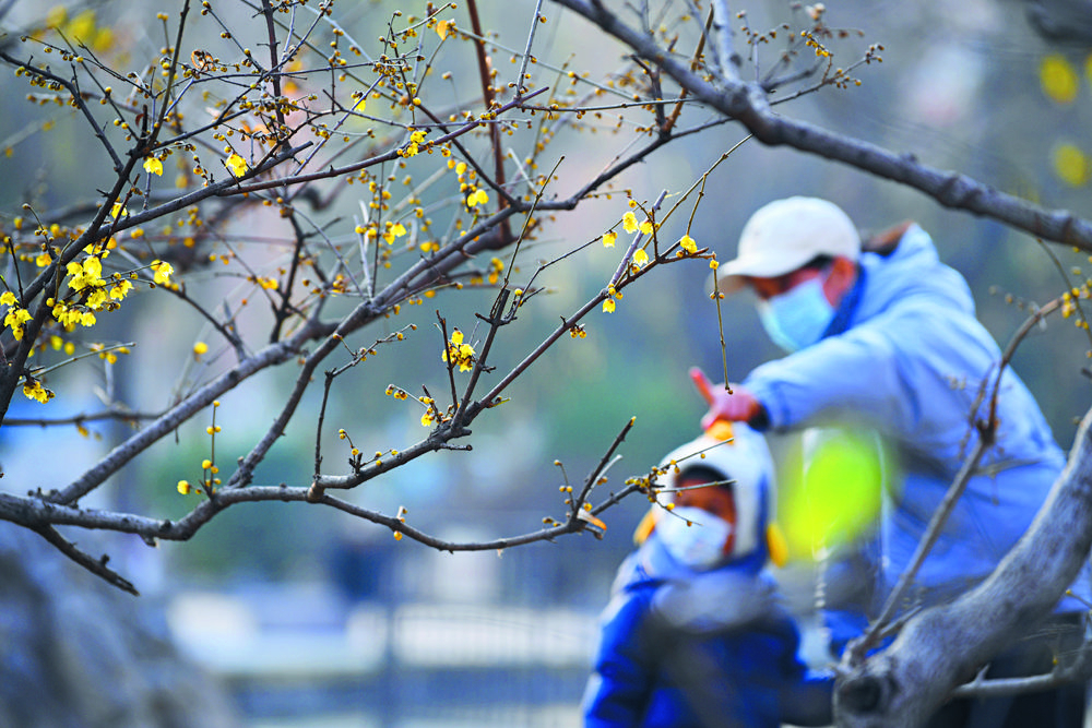 1月5日,石家庄市平安公园内腊梅飘香,金黄色的花朵次第开放,吸引游人驻足观赏。石家庄日报记者 郄 磊 摄