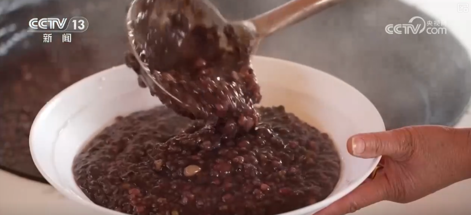 经过2个多小时的慢火熬煮,热气腾腾的腊八粥香漫街巷,当地村民和外地游客都可免费领取。