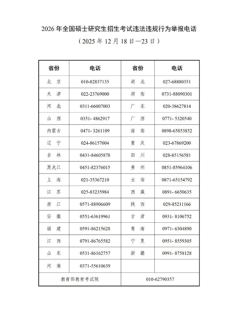 2026年全国硕士研究生招生考试在即,教育部于12月18日向社会公布2026年全国硕士研究生招生考试违法违规行为举报电话。