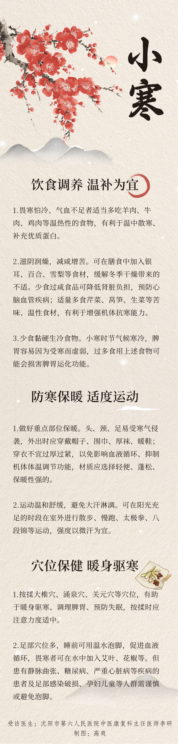 1月5日是小寒节气。这个节气,多地进入全年最冷时期,如何通过合理膳食、适度运动、穴位保健等,达到增强体质的目的?让我们通过海报,了解一下小寒时节的养生知识。