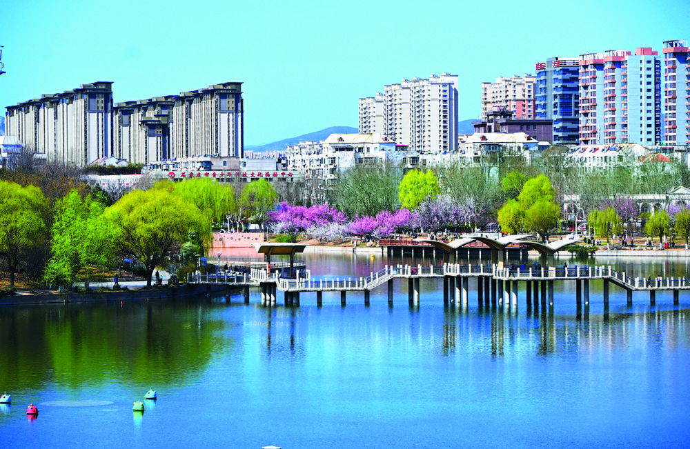 3月18日,石家庄市水上公园天蓝水清、花红柳绿,一派春意盎然的美丽景色。