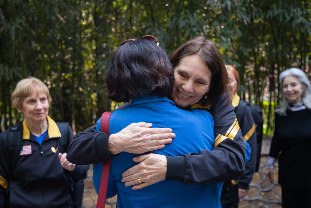 4月8日,在北京大学,美方“乒乓外交”亲历者朱迪·霍尔弗罗斯特与中方亲历者郑敏之在重逢时热情拥抱。 北京大学供图