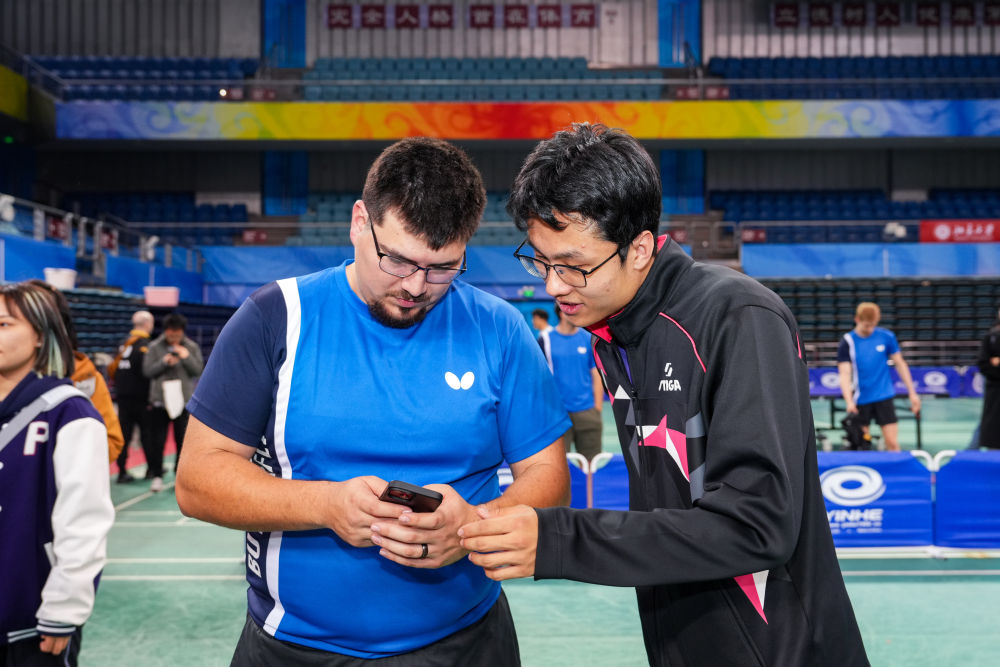 4月8日,北京大学邱德拔体育馆,美国乒乓球运动员德文·德莱昂(左)与中国球员互留联系方式。 北京大学供图。