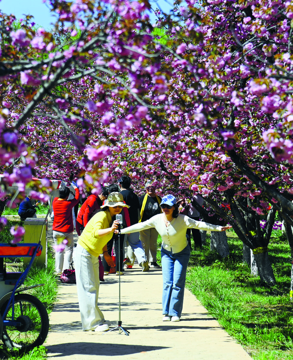 春光正好,石家庄市各大公园内繁花似锦。樱花、海棠、郁金香、丁香、紫荆等花卉竞相绽放,五彩斑斓、芳香四溢,绘就一幅生机盎然的春日美景。图为市民在植物园游玩赏花。 张 震 摄
