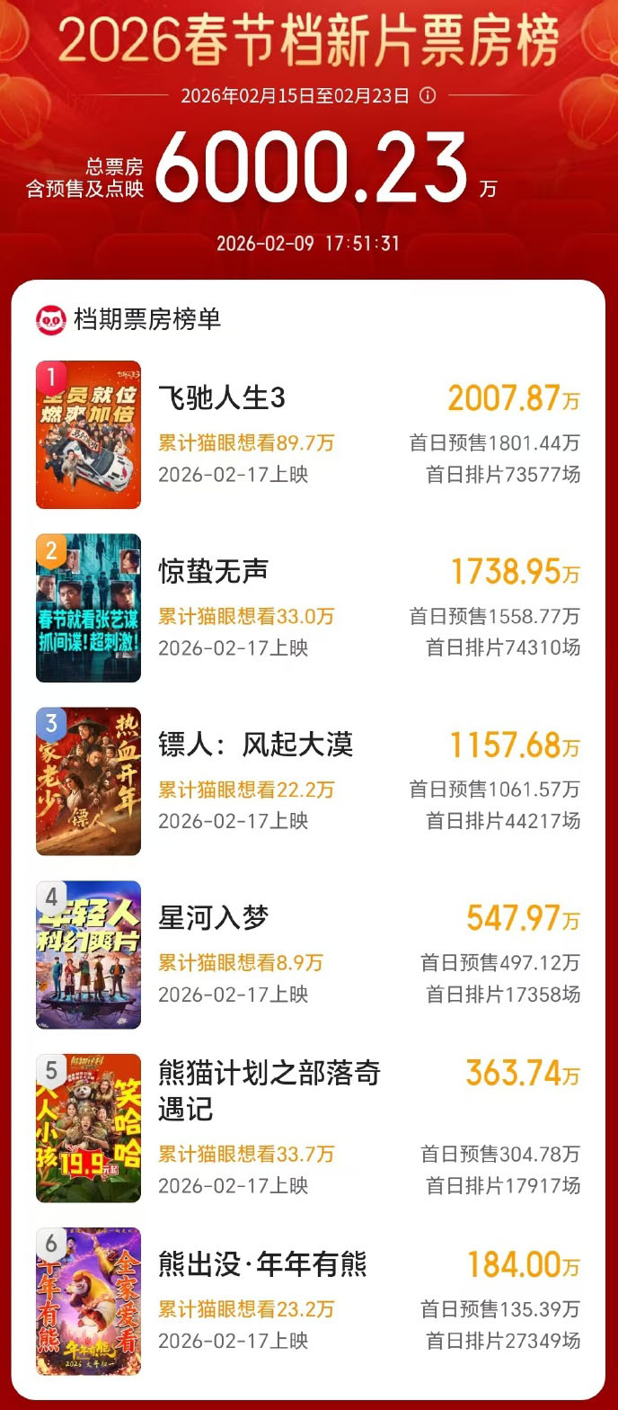 央视网消息:据网络平台数据,2026年春节档新片预售总票房破6000万,《飞驰人生3》《惊蛰无声》《镖人:风起大漠》分列2026年春节档新片预售票房榜前三。