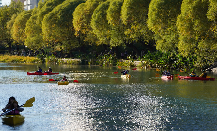 市民在北京亮马河上体验皮划艇(2022年10月22日摄)。新华社记者 陈钟昊 摄