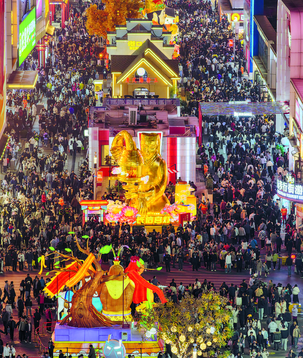石家庄湾里庙步行街游人如织,人们赏灯、购物,享受快乐时光。