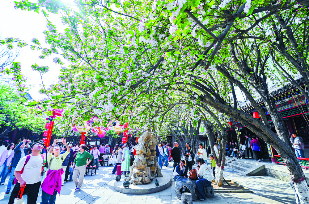 春暖花开,河北省石家庄市正定县荣国府景区里西府海棠盛开,吸引了众多游客前来观花赏景,感受古城之美。图为游客在荣国府欣赏盛开的西府海棠。 张晓峰 摄
