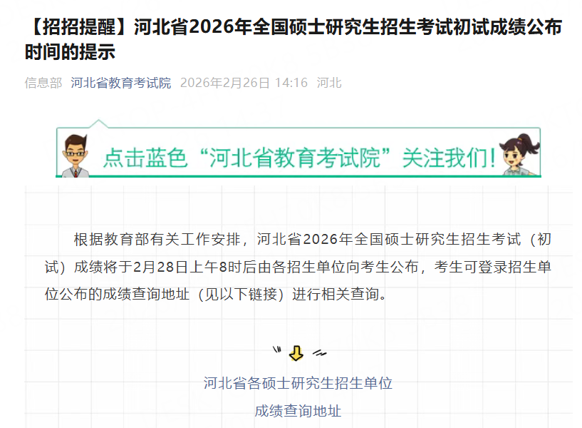 2月26日,河北省教育考试院微信公号发布河北省2026年全国硕士研究生招生考试初试成绩公布时间的提示。根据教育部有关工作安排,河北省2026年全国硕士研究生招生考试(初试)成绩将于2月28日上午8时后由各招生单位向考生公布,考生可登录招生单位公布的成绩查询地址(见以下链接)进行相关查询。