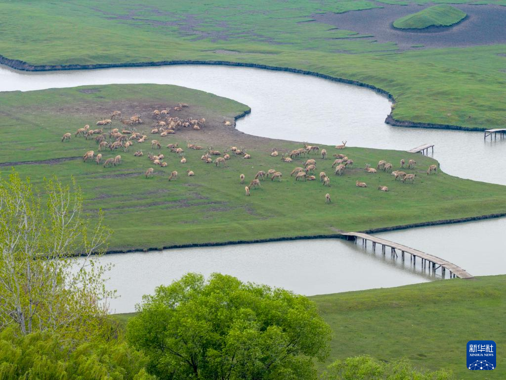 4月15日,麋鹿在江苏东台条子泥湿地栖息觅食(无人机照片)。