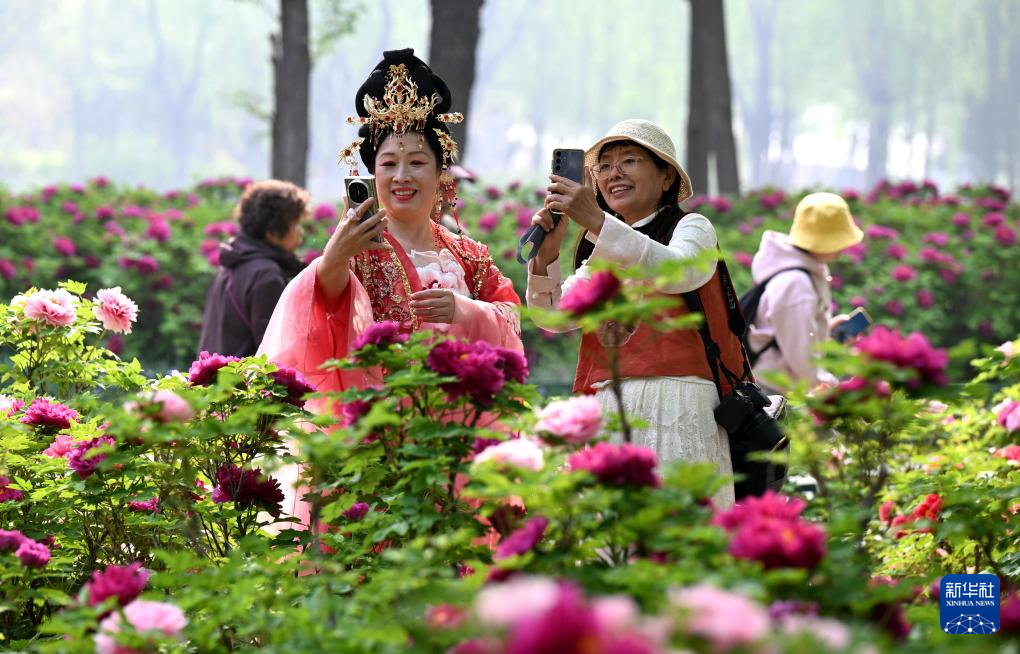 4月15日,游客在河北省石家庄市植物园内牡丹园赏花拍照。