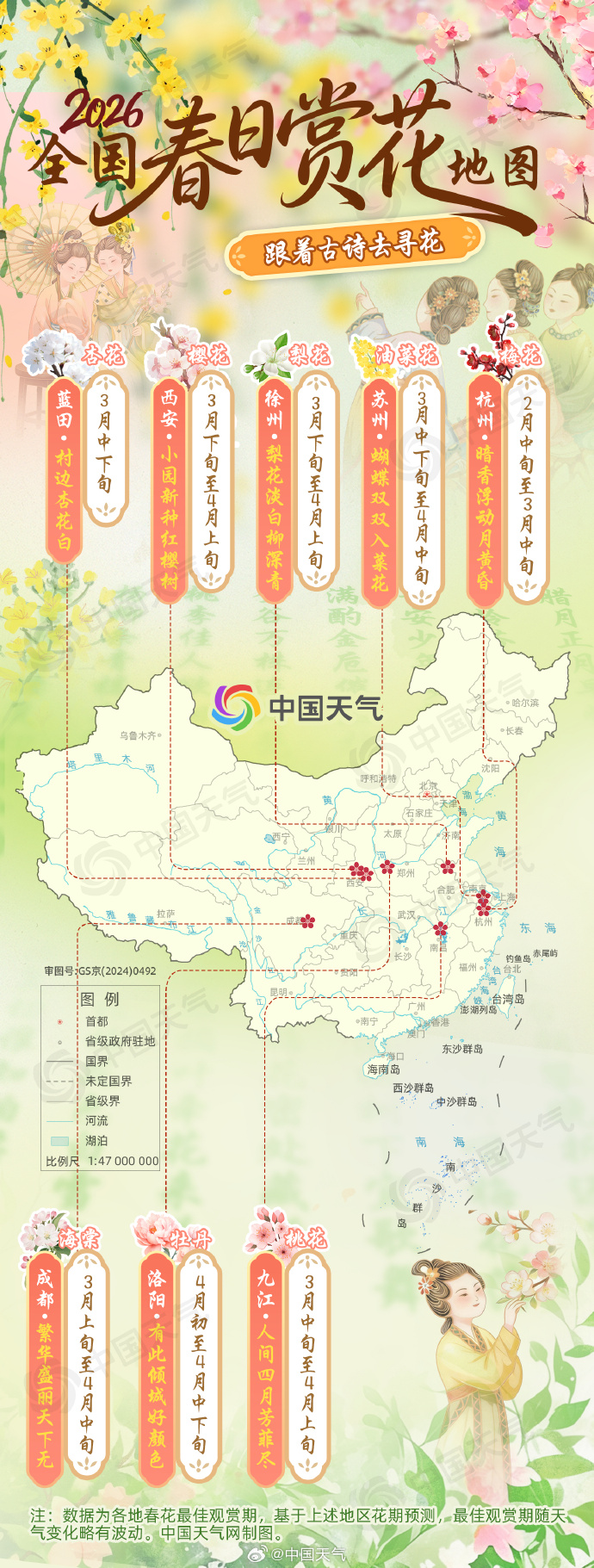 眼下已是惊蛰节气,仲春启幕,万物复苏。随着气温回升,各地花事繁忙起来,桃花红、杏花白、樱花粉……春日气息日渐浓郁。从古至今,春花与诗词相互交融,成为独属于中国人的春日浪漫。2026年春色正在铺展,循着花期与诗意,中国天气推出全国春日赏花地图,邀你赴一场古诗里的寻花之旅。