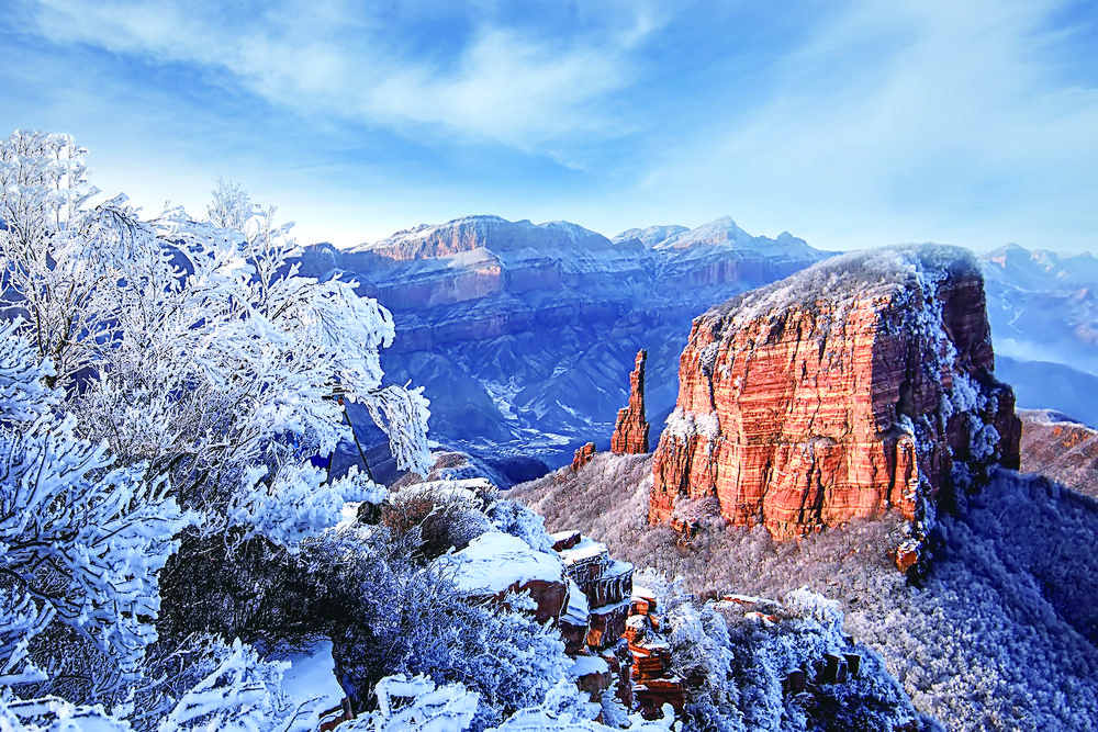 冬日的石家庄市赞皇县嶂石岩景区里,丹崖赤壁如刀削斧劈,峻岭奇峰连绵起伏,空气清新得让人忍不住深呼吸。