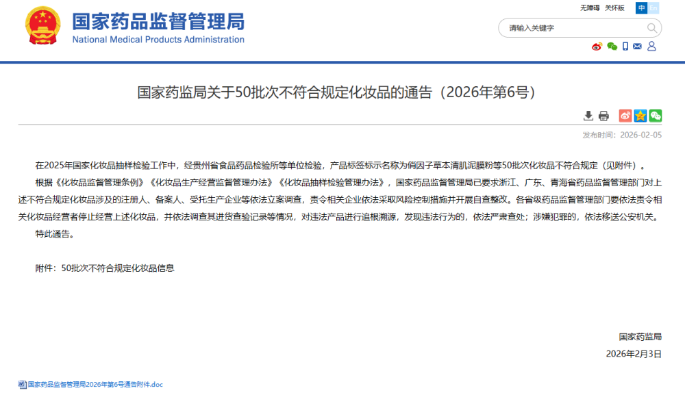 国家药监局关于50批次不符合规定化妆品的通告(2026年第6号)