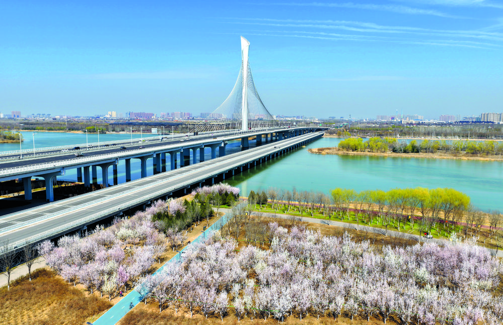 3月19日,石家庄晴空万里、春光正好,滹沱河畔处处春意盎然。荡漾的碧波、迎风绽放的山桃花与复兴大街滹沱河大桥交相辉映,勾勒出一幅灵动秀美的春日生态画卷。