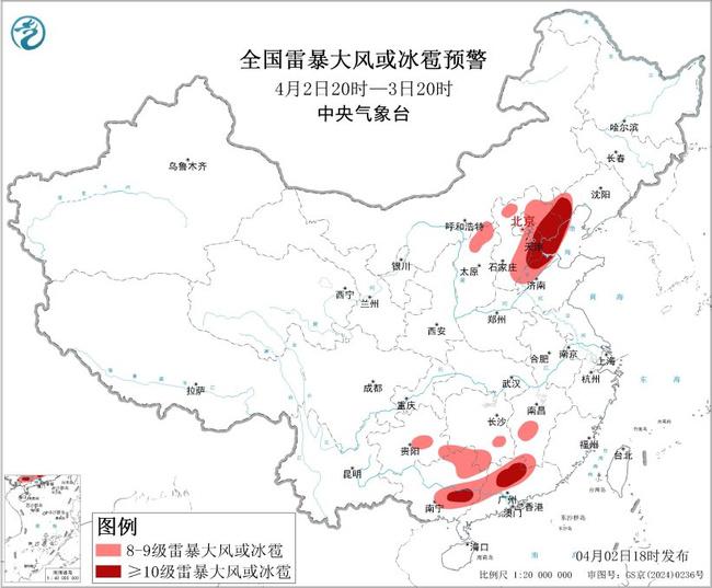 预计4月2日20时至3日20时,华北中东部、江南西南部、西南地区东部、华南等地的部分地区将有8级以上雷暴大风或冰雹天气,其中,辽宁西部、河北中东部、天津、山东北部、广西东部、广东中北部等地的部分地区将有10级以上雷暴大风,最大风力可达11级以上;华北东部、江南、西南地区东部、华南等地的部分地区将有小时雨量大于20毫米的短时强降水天气,其中,广西北部、广东中北部等地的部分地区小时雨量大于50毫米。