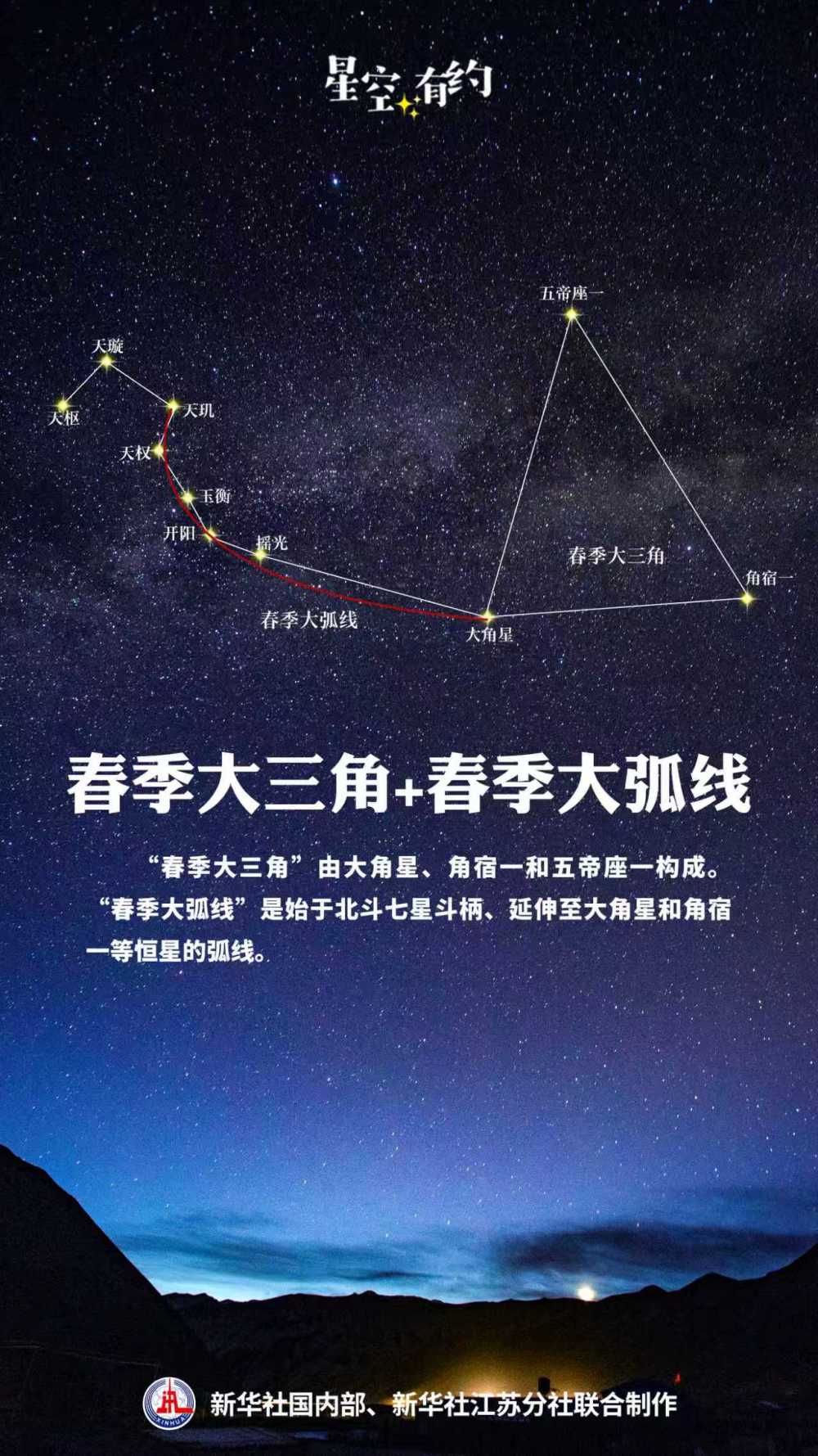 始于北斗七星斗柄、延伸至大角星和角宿一等恒星所形成的弧线,被天文爱好者们形象地称为“春季大弧线”。不仅如此,大角星、角宿一还和五帝座一共同构成著名的“春季大三角”,是春季夜空的标志之一。