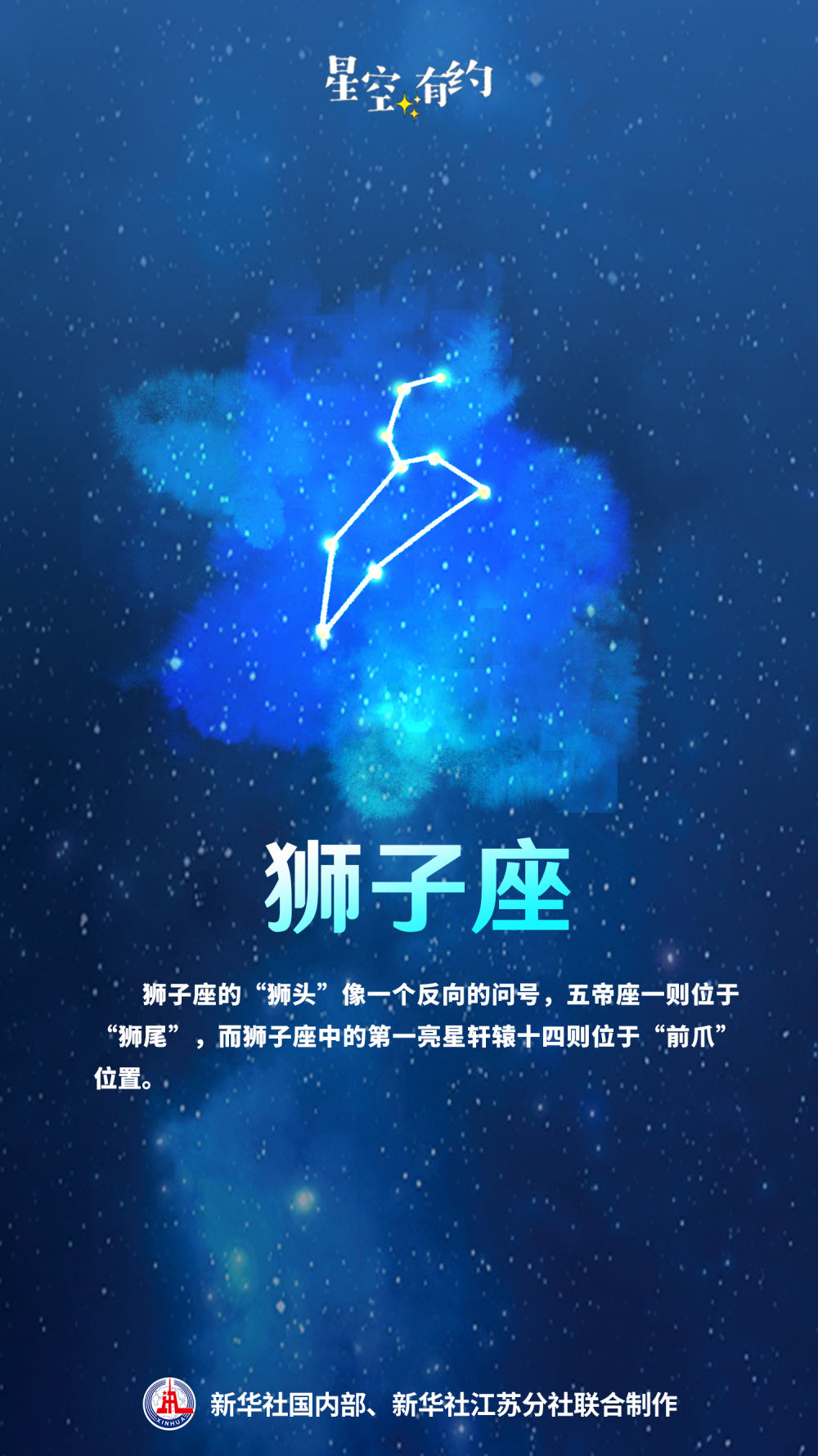 五帝座一所在的狮子座,是春季夜空当之无愧的“主角”之一。王科超说,由六颗恒星组成的“狮头”像一个反向的问号,五帝座一位于“狮尾”,而狮子座中的第一亮星轩辕十四则位于“前爪”位置。狮子座的观测可以从3月持续至8月。