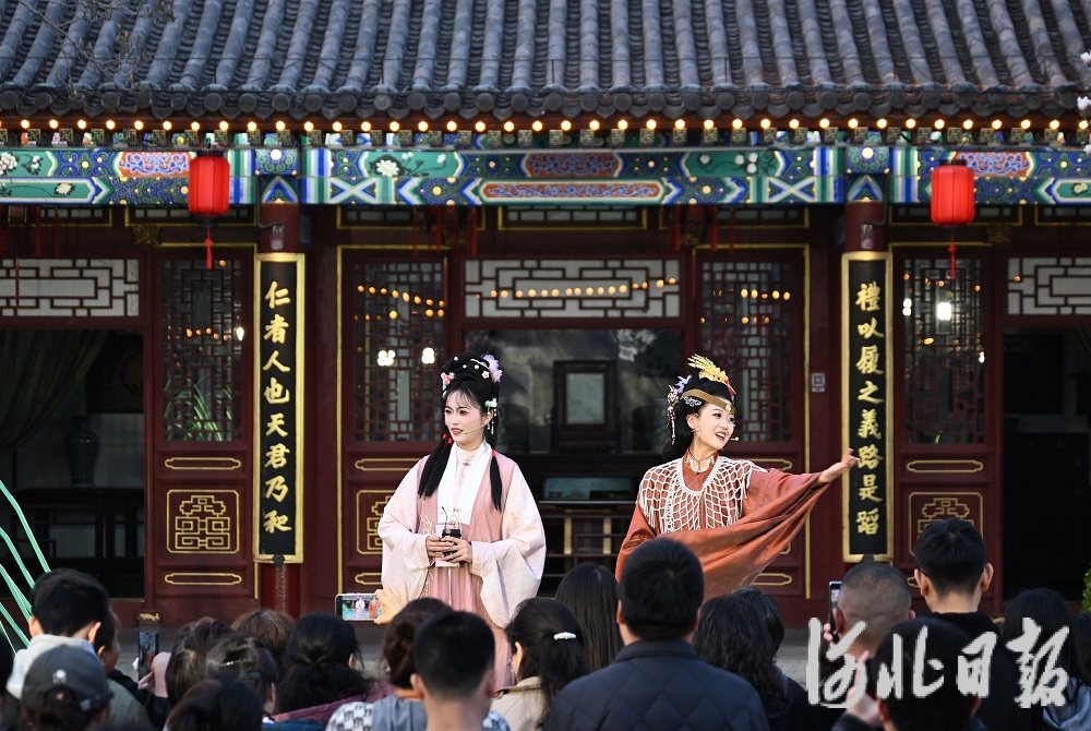 3月20日,游客在正定荣国府景区观看“一梦入红楼”演出。