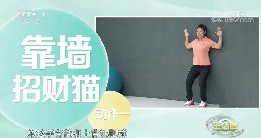 如果出现五点不能完全紧贴墙面的情况,说明可能出现了含胸驼背的现象,这个时候我们可以通过“靠墙招财猫”的动作,强化背肌力量,改善驼背体态。