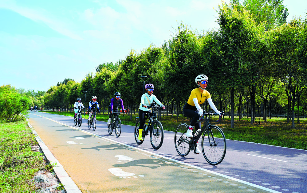 市民在石家庄滹沱河畔的环城绿道骑行。