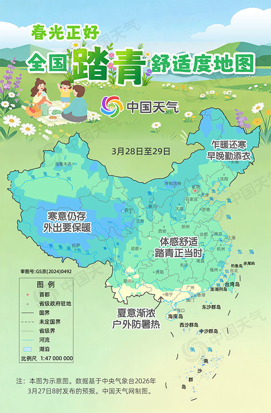 从中国天气网推出的全国踏青舒适度地图来看,本周末,我国中东部大部体感舒适,适宜踏青出游;内蒙古大部、黑龙江、吉林、山西大部、宁夏等地春寒料峭,白天暖意冒头,早晚天气寒凉,户外踏青需添衣;青藏高原多地寒意仍存,寻春尚需时日。