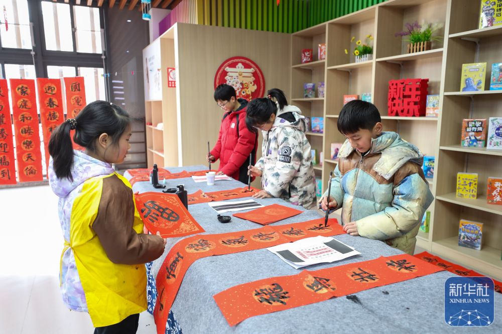 ↑ 2月7日,在江苏省兴化市昭阳街道的一家新华书店,学生在“书香里的年味”新春主题活动中书写对联。新华社发(周社根摄)