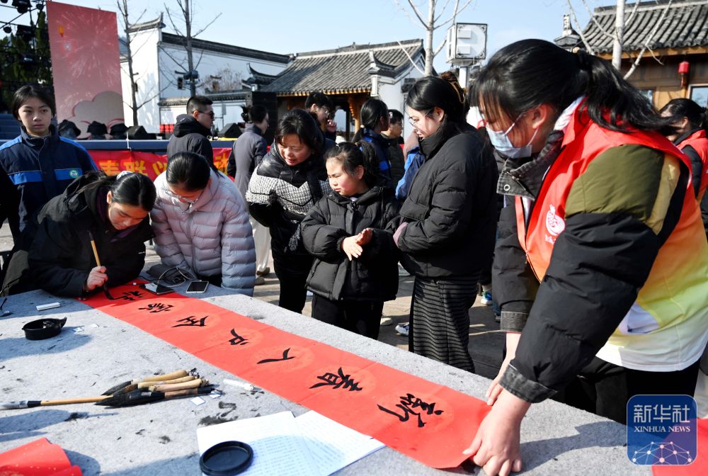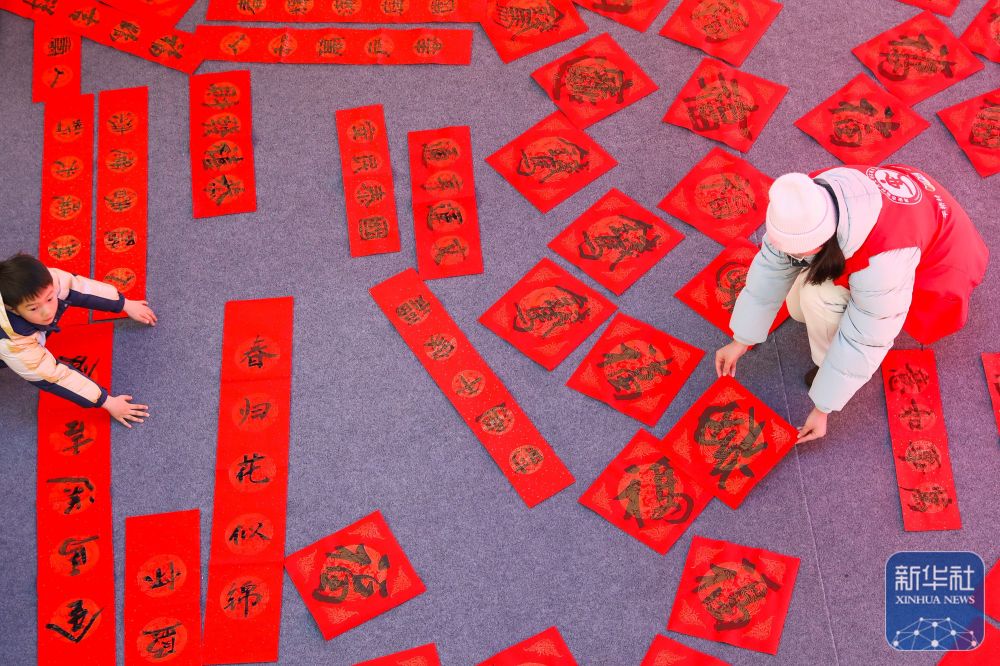 ↑ 2月8日,学生志愿者(右)在江苏省海安市政协书画联谊会送福字、赠春联文化惠民活动现场整理书法作品。新华社发(顾彬斌摄)