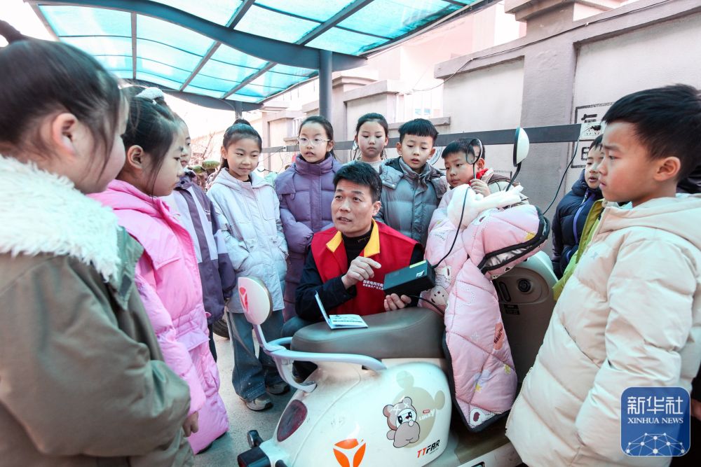 ↑ 2月5日,在河南省焦作市博爱县新华小学,供电职工为学生们讲解安全用电知识。新华社发(程全摄)