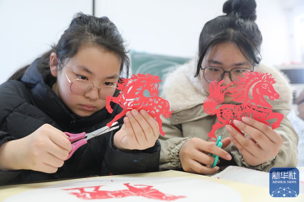 ↑ 2月8日,河南省焦作市温县的学生在一家培训班学习制作“马”剪纸作品。新华社发(徐宏星摄)