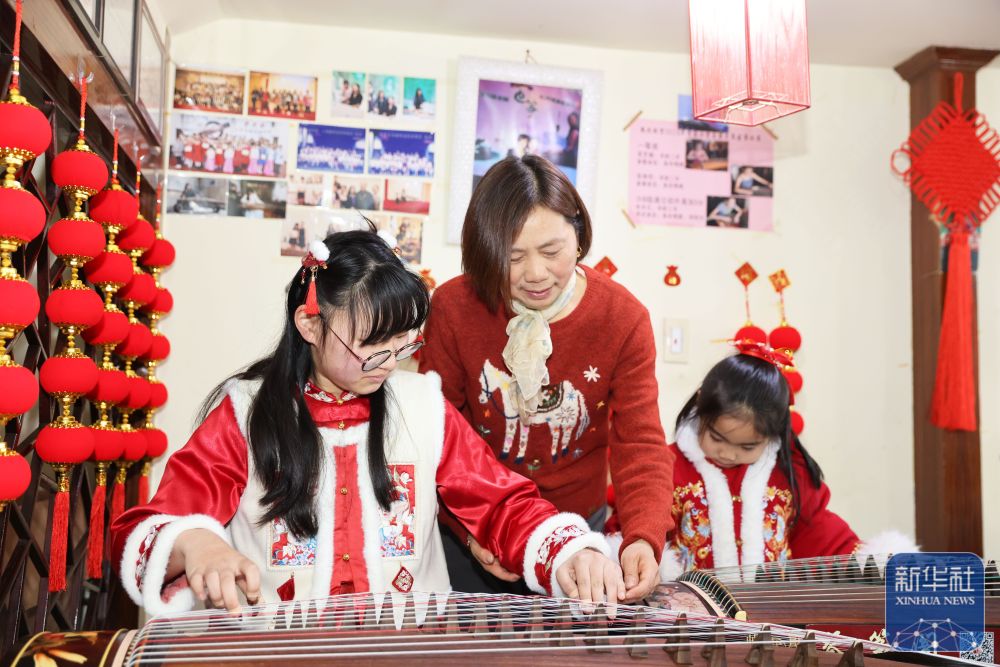 ↑ 2月8日,孩子们在浙江省湖州市德清县乾元镇一家琴行练习弹古筝。新华社发(倪立芳摄)