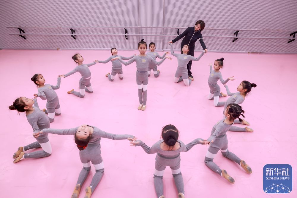 ↑ 2月8日,在湖北省歌剧舞剧院艺术教育中心,孩子们在舞蹈老师指导下排练舞蹈节目。新华社发(赵军摄)