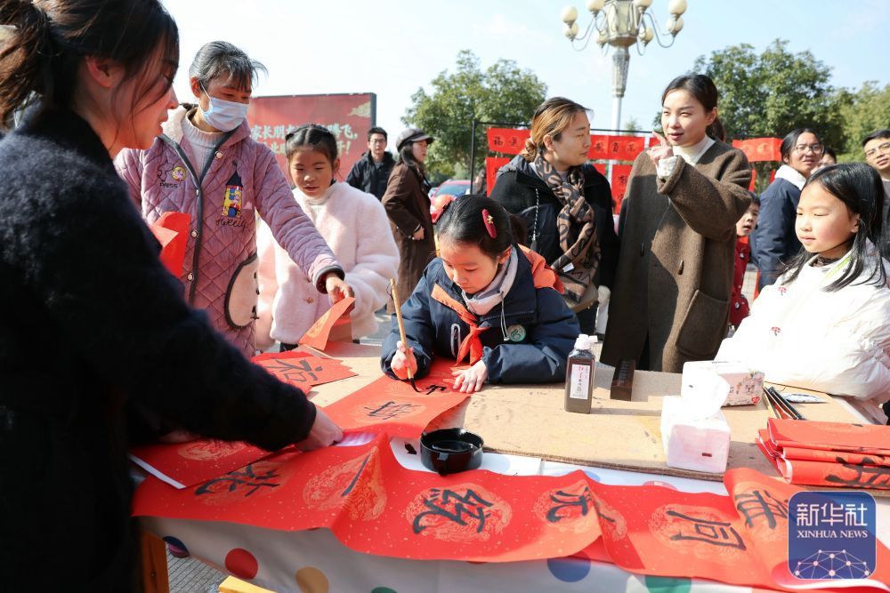 ↑ 2月8日,在浙江省东阳市花园外国语学校小学部,书法俱乐部的学生在写春联。新华社发(包康轩摄)