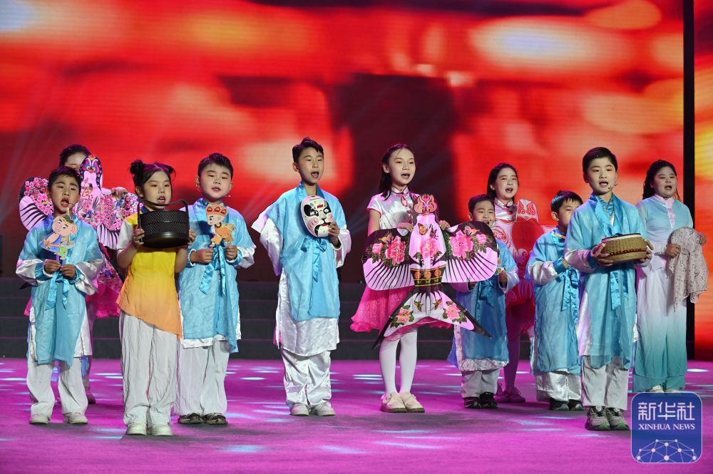 ↑ 2月8日,在河南省沁阳市朱载堉音乐厅,小朋友们在“少儿春晚”上表演集体诗朗诵《非遗里的中国》。新华社发(杨帆摄)