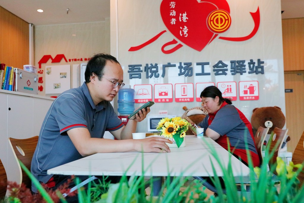 “快递小哥”在工作间隙到唐山市路北区吾悦广场工会驿站休息。河北日报资料片
