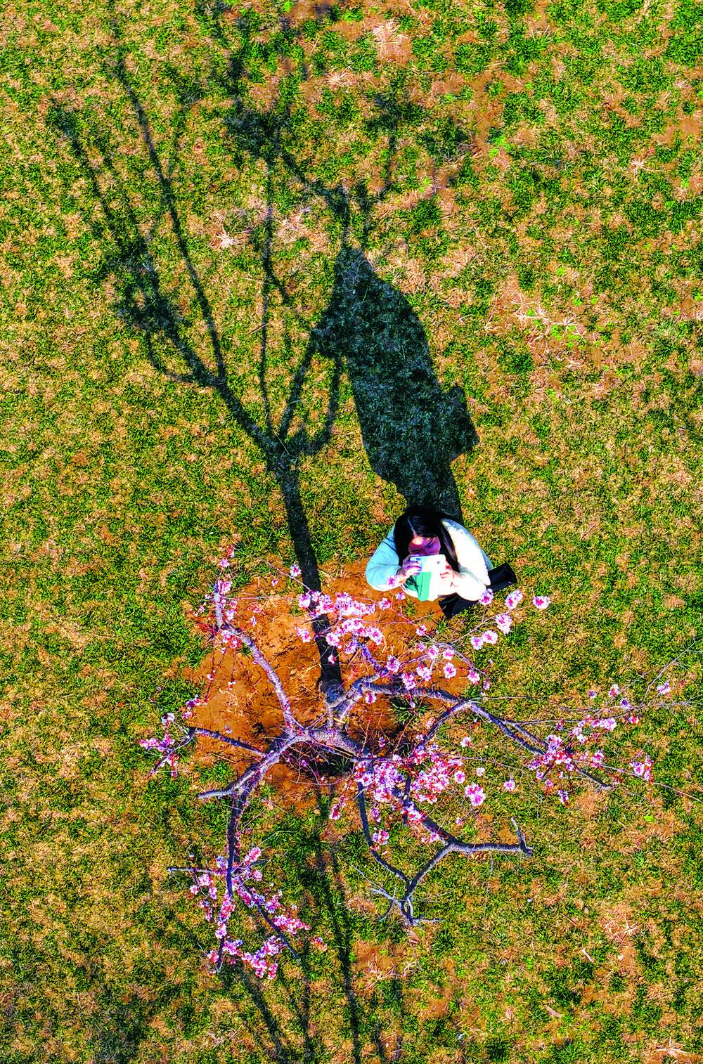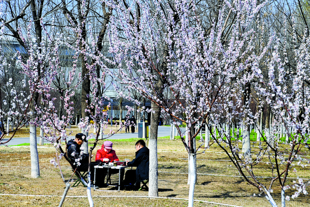 市民在石家庄市滹沱河畔的桃花林中享受春日里的美好时光。首席记者 张 震 摄