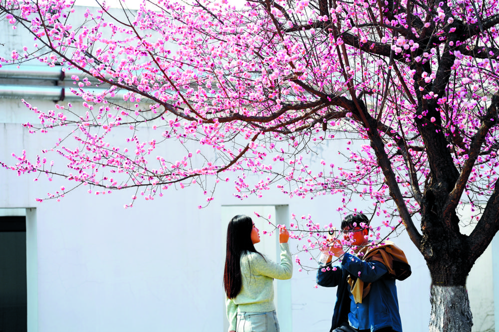 石家庄市植物园内盛开的梅花吸引了市民前来拍照打卡。首席记者 张 震 摄