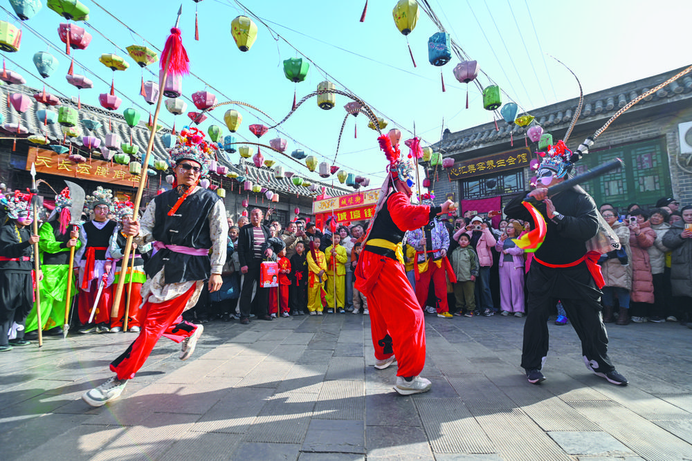 图为2月22日,游客在石家庄市井陉县天长镇北关村观看花脸社火表演。 张晓峰 摄