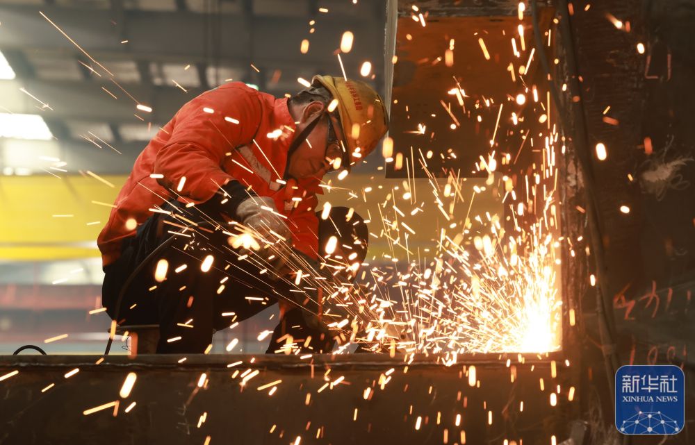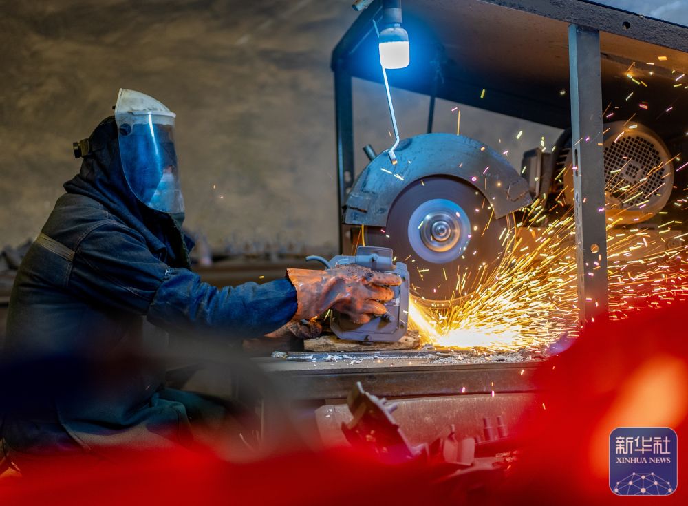 ↑ 2月25日,在中铁科工集团武汉江夏制造基地,技术工人对门吊配件进行打磨作业。新华社发(赵军摄)