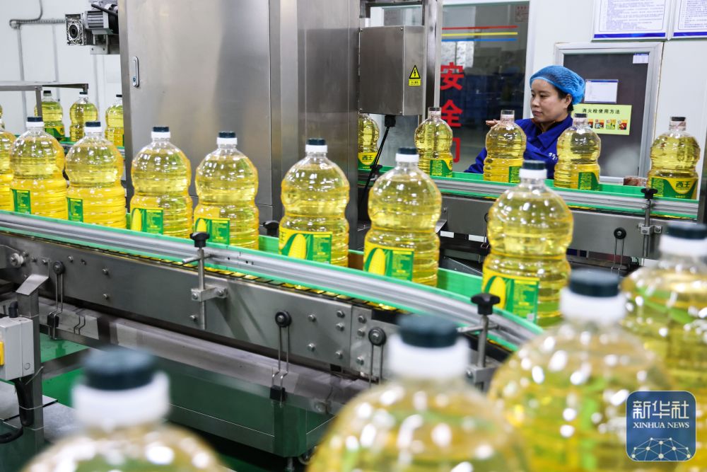 ↑ 2月25日,工人在山东省邹平市韩店镇一家食品公司玉米油生产线上作业。新华社发(董乃德摄)